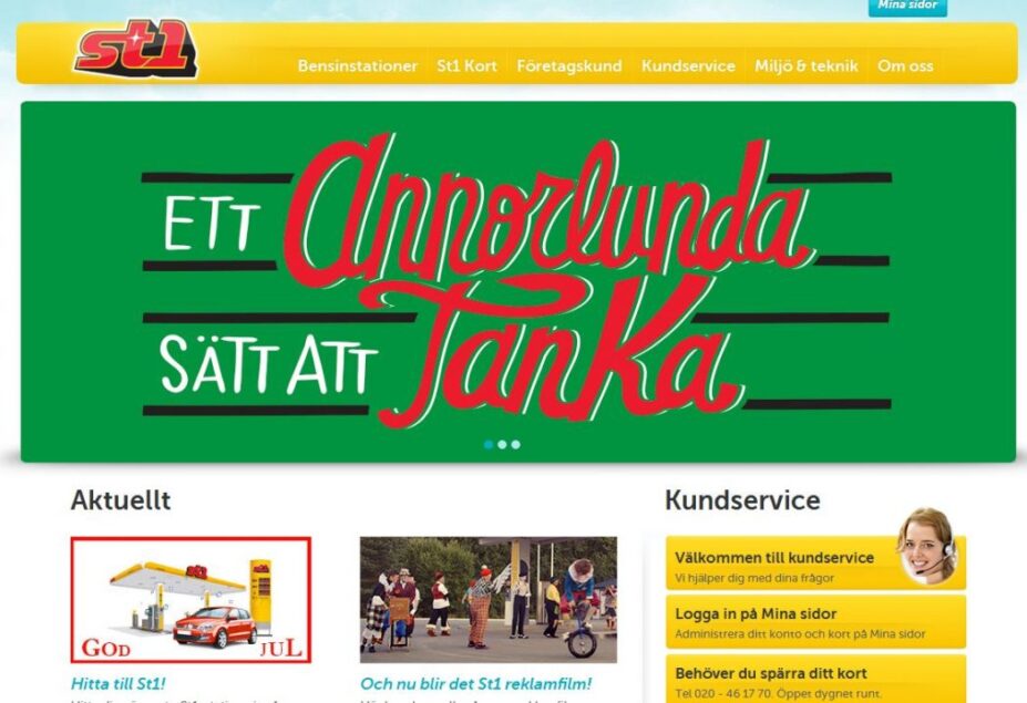 Den nya ST1.se-sajten har fått Gif-animationer på startsidan (!), en snabbrullande carousel, en Mina-sidor sektion, Google Maps med geolocation för att hitta stationer samt gula stora målgruppsingångar (hela sex stycken) på startsidan. Det finns en tydlig egenskap för konvertering på sajten, onlineansökan om att bli kund hos St1. Men den ligger hela tre klick bort från främst ingången och trots att den är digital med BankID och E-legitimation stöd är den inte speciellt integrerad med resten av webblösningen.