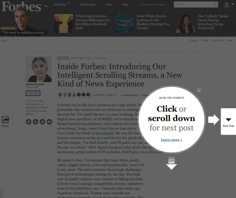Vad Forbes hittar på är en tydlig högerpil som via javascript laddar in nästa artikel inom ett område, inte hel olikt den artikellistning direkt efter en artikel som många onlinetidningar redan har. Men med möjligheten att bläddra vidare redan innan läsaren hunnit ned till slutet av en artikel. Samt att artikeln inte kräver laddningstid innan den efterfrågats. Samma effekt uppnås även efter att en artikel lästs klart.