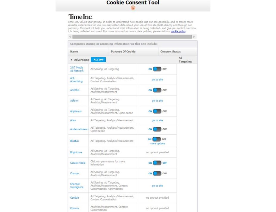 Det erbjuds möjlighet att klicka för och av exakt vilka företag som får göra vad. I praktiken är ännu inte så många tjänster syndikerade mer än att en kaka kommer skapas som sedan annonsnätverket (eller dylikt) kan läsa av och förstå att just de inte får spåra mig. Många har inte ens denna funktion påslaget, de bara erbjuds kontakt via tjänsten.