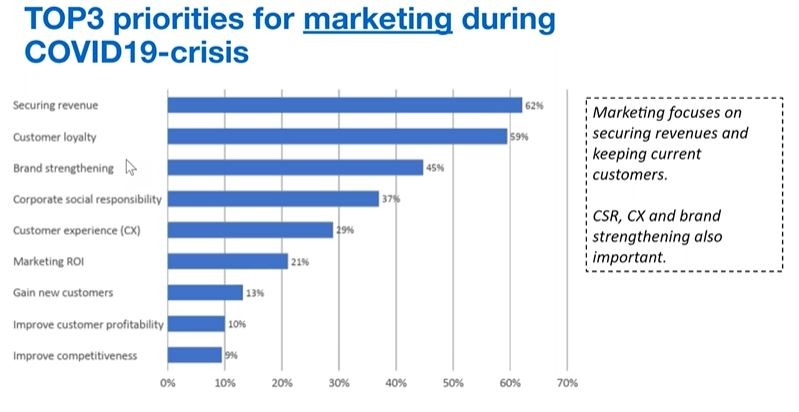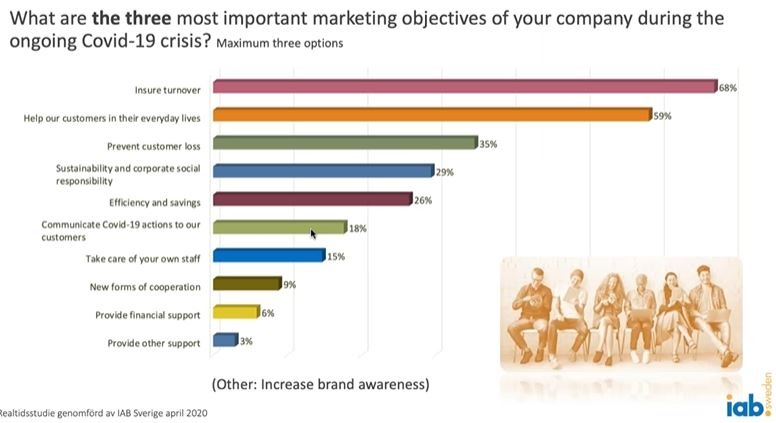 VD Charlotte Thur från IAB Sverige berättade under skärtorsdagen att öka omsättningen är helt i topp följt av hjälpa kunder, minska kundförlusten samt CSR arbete. Runt 5% bedömer att deras marknadsföring faktiskt ökar samtidigt som 24% säger den minskar med mer än 30%. Flest CMO i Sverige anser inte att budgeten påverkas alls, motsvarande hela 34%.