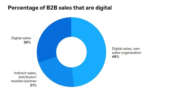 Hela 69 % av B2B-företagen använder nu digitala kanaler för att möjliggöra försäljning. Och över en tredjedel (38%) av B2B-företagen erbjuder en e-handelslösning, med eller utan obligatorisk inloggning för onlineköp. Hela 81 % av de största företagen (+500 miljoner i intäkter) erbjuder någon form av digital försäljning, vilket är cirka 20 procentenheter högre än de minsta företagen.