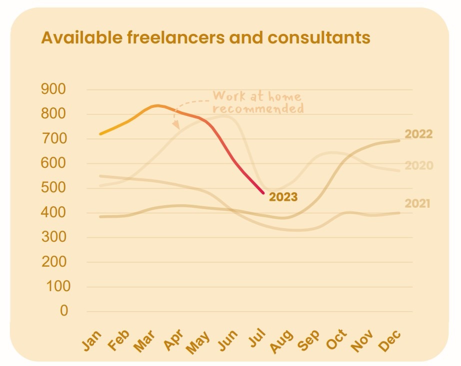 Brainville har tittat på antalet tillgängliga IT-konsulter nu efter första halvåret 2023 är passerat. Det visar på hela +83 procent fler tillgänliga konsulter på bänken jämfört med strax efter pandemiavslutet 2022.