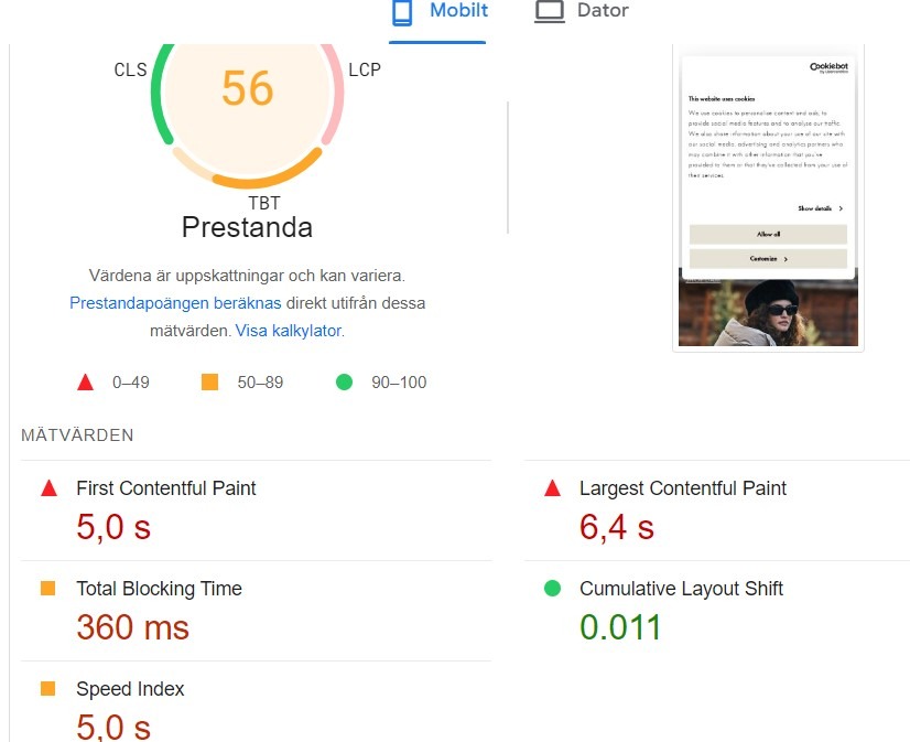 Detta har någorlunda införlivats i dagens release, nya mätsiffror med nuvarande ”perf”-mätverktyg ger under tisdagen 56/100 i mobilen. I desktop är man däremot ”through the roof” just nu med mätvärden om hela 98/100. Runt 95-97 vid några alternativa mätningar. Riktigt bra jobbat med CDN, cache, uppbyggnad av inladdade objekt osv.