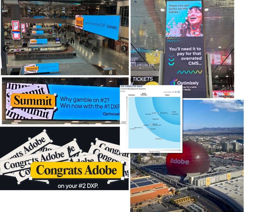 Optimizely är nästan opassande nöjda över sin position i Gartner DXP-kvadranten som kom för en månad sedan. Deras marknadsteam använder prestationen för fullt i alla möjliga olika sammanhang. Se ny bild ovan på rådande kampanj som även under just avslutade Adobe Summit i Las Vegas ska ha plastat in stora delar av kommunala färdmedel och närliggande billboards på plats utanför konferensen. Att FUD:a på motsvarande sätt har historiskt inte alltid lönat sig, varken för Optimizely eller för andra aktörer inom sektorn.