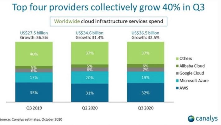 Med en marknadsandel om blott 1/3 av Microsoft Azure eller runt 1/6 av AWS har allt fler tecken tytt på att Google GCP kommer att bli ”Public Cloud Big Three”-aktören som står för de mer öppna standarderna och för att minska eventuell ”cloud-inlåsning”. Det är även den fullt logiska strategin då inte heller GCPs marknadsandelar globalt förändrats de senaste åren (se Canalys-bild nedan).