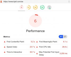 Det första vi gör är testa denna nya prestandamaxade tripp. Det är inga extrema resultat ännu. Från den närmaste europeiska servern på Pingdom får Kjell.com ett ”D” och totalbetyget ”66” vid två försök tidigt under onsdagsmorgonen. 1,7MB-sidan tar 2,56 sekunder att ladda in. Ett Google Lighthouse test ger låga 6/100 i betyg efter bl a en interaktivitetsinladdning på hela 30,7 sekunder. Vid två separata tester.