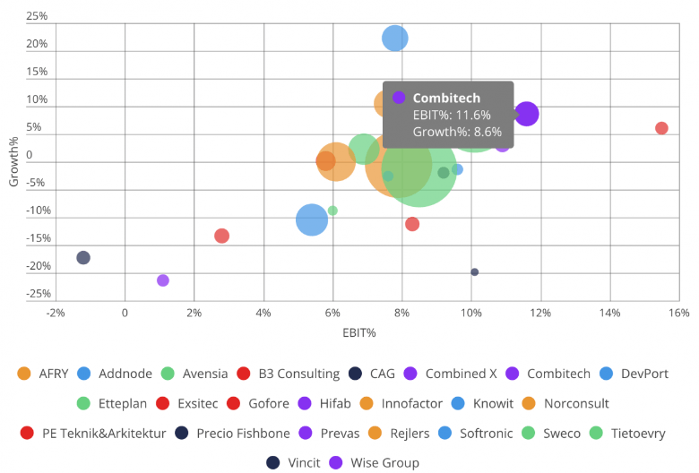 Efterfrågan inom energi, fordonsindustri, life science, försvar och cybersecurity är fortfarande väldigt stor. Addnode, Rejlers och Combitech växte snabbast. Högst rörelsemarginal hade Exsitec, Combitech och Prevas.
