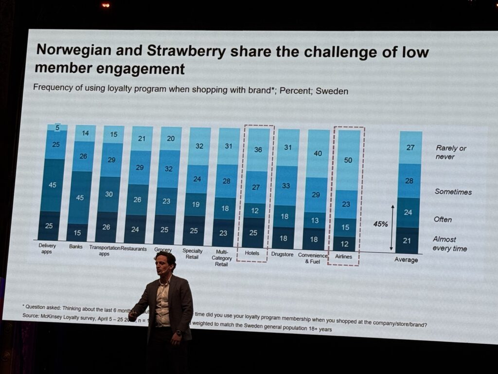Det är anmärkningsvärt att det är konkurrenten Optimizelys mångåriga prestigekund Norwegian som även här är representerat med en avslutande keynote för att prata om just samma typ av ämnen, CX, optimization och personalisering inom flygbolaget och deras nya lojalitetsprogram Spenn tillsammans med Strawberry (se fler bilder om det nedan). Det norska flygbolaget verkar onekligen kört flera parallella martechspår 2023-2025.