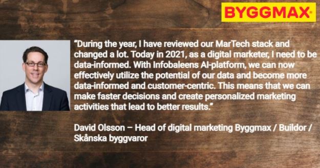 ” – Under året har jag sett över vår martech-stack och mycket har förändrats. Idag 2021 behöver jag som digital marknadsförare vara datainformerad. Med Infobaleens AI-plattform kan vi nu effektivt utnyttja potentialen i vår data och bli mer datainformerade och kundcentrerade. Det gör att vi kan fatta snabbare beslut och skapa personliga marknadsföringsaktiviteter som leder till bättre resultat.”