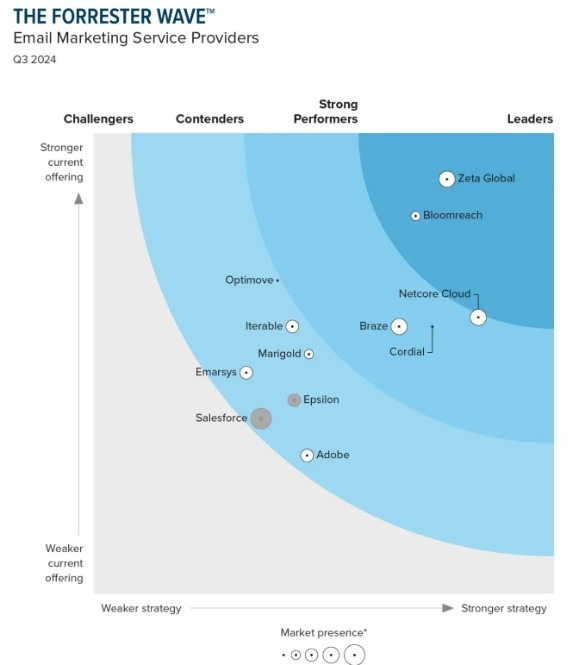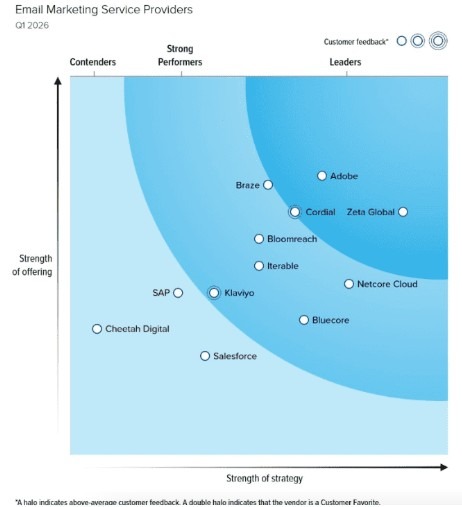 Bästa EMP (Email Marketing Service Providers) och Marketing Automation-stöd 2026 enligt Forrester? Det är nya ledaren Adobe i rätt ensam majestät där uppe. Följda av Zeta Global samt Cordial. Braze, Bloomreach, Netcore cloud och Iterable skuggar där bakom.