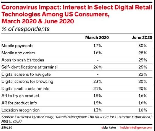 Emarketer har tittat närmare på hur vi i en Covid-19 värld anpassat oss digitalt och anammat olika typer av digitala tjänster inom fysisk och online shopping. Det intressanta är att den nya datan kommer från flera kvartals insamlade uppgifter av McKinsey. Samt att det även fanns ett aktuellt, jämförande dataspekturum från första kvartalet 2020.