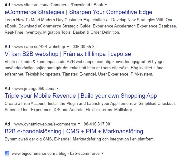 Men marknaden med B2B e-handelsplattformar fylls snabbt på. Det är rätt många nischade plattformstillverkare som köper annonser vid sökningar på ”B2B e-handel” idag. Dessutom har drakarna inom e-handel, utan större ansträngningar med anpassning, kunnat börjat anpassa egna portföljerna efter det förmåge- och egenskapsstöd som B2B-kunder efterfrågar. Skillnaderna mellan B2C och B2B minskar dessutom kontinuerligt.