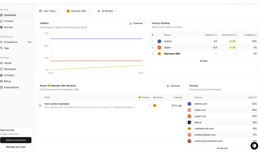 Peec har i övrigt stöd som att se hur konkurrenter rankar, á la SEMRush SEO eller Moz.com, det finns grafer över förändring över tid, LLM källor, trender, mentions, olika promptar man kan följa osv.