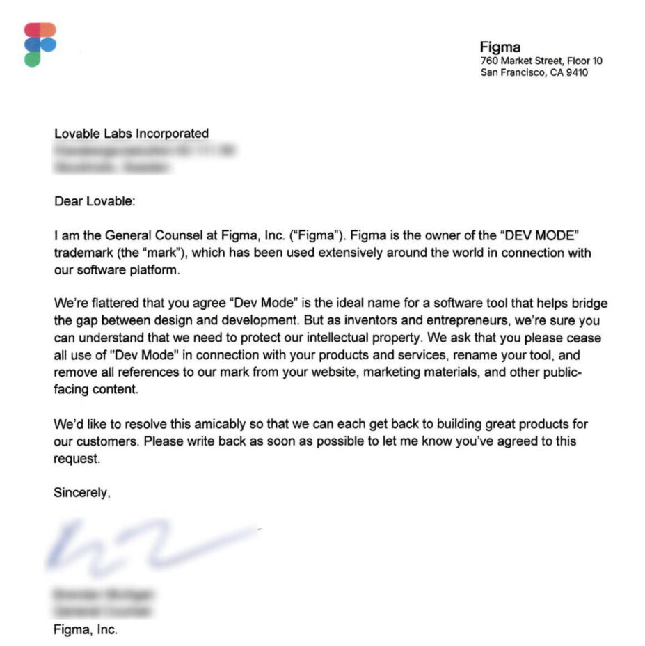 Figma utstrålar väldigt mycket oro över svenska Lovable då de via sina jurister ber AI agent utvecklingstillverkaren och Vibe Coding ledaren omgående ta bort senaste veckans nylansering ”dev mode” från egna namngivningen och terminologin.