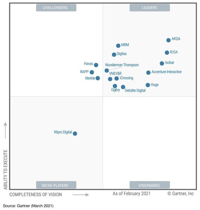 Vilka byråer är bästa 2021 på martech och som ”marketing agencies” enligt gällande Gartner kvadranten? För att hamna på listan ska man kunnat utföra bevisat stöd och kompetens inom strategi och utförande av team från olika kontor världen över. Det är Volvos favoritbyrå AKQA som toppar. Följda av R/GA samt MRM och Digitas som toppar. Strax före Isobar, Wunderman Thompson och Accenture. Anmärkningsvärt är att den sistnämnda inte rört sig en millimeter, trots fortsatta mångmiljardinvesteringar på förvärv och rekrytering inom området.