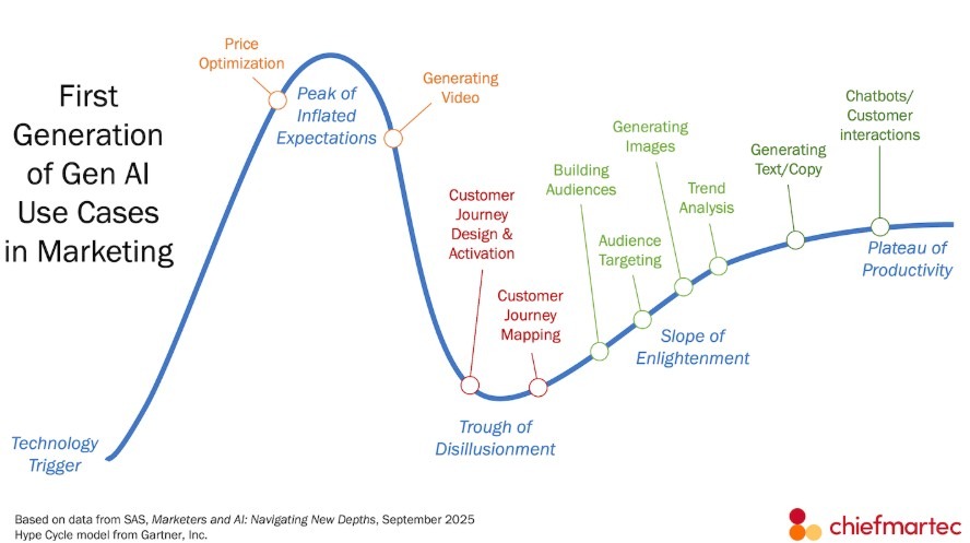 Scott Brinker har tagit upp Gartners Hype Cycle och skapat en egen variant för att påvisa vilka delar av allt inom AI/AI-trender/genAI för marketers som kanske passerat hypecykeln och går in mer praktiska, eller övergivna för den delen, tillämpningar. Där hittar vi Sora 2 och Veo 3 och videogenerering som fortfarande rider högst på en våg. Även AI inom prisoptimering ligger bra till och borde bli ett mer förekommande...