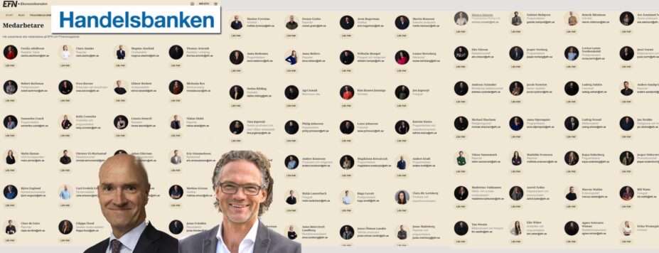Green, som numera varit VD i runt 11 månader, och Handelsbankens nyhetstjänst EFN fortsätter spendera på högprofilerad och omfattande egen personal. Gruppen av egna anställda på redaktionen (se bild) närmar sig tresiffrig. Därtill kommer flera nya tekniska satsningar. Det har tidigare framkommit att banken valt satsa hela 100 miljoner