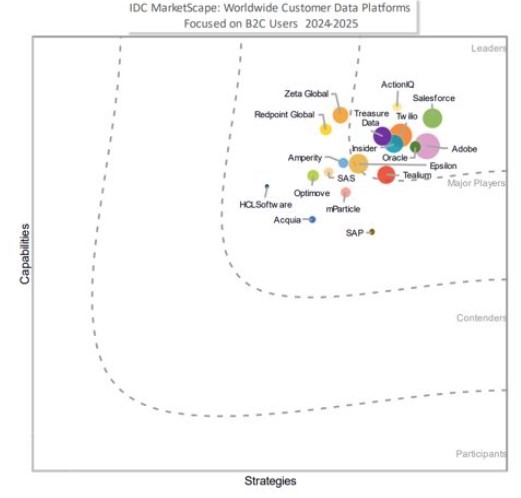 Rätt många i ”ledarcirkeln”, med andra ord. Därefter syns Zeta Global, Redpoint Global, Epsilon, Amperity, Tealium, SAS, Optimove, mParticle, HCL Software, Acquia och SAP. Allihopa är lite ängsligt placerade väldigt, väldigt tätt i toppen av grafen som större spelare eller en av sju (!) ledare. Inte mycket som sticker ut i IDCs rapportering eller som är vågat eller nytänkande här, med andra ord.