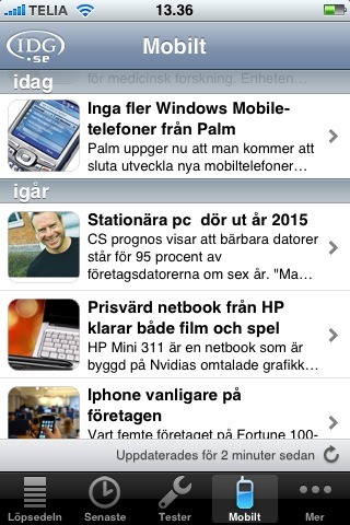 IDG.se har släppt sin första iPhone app. Vad App’en gör? Listar nyheter. Det är det. Robert Brännströms löpsedel, de senaste artiklarna, tester och Mobilt finns som val. Dessutom finns filtrerande checkboxes för ämnesområden som Affärssystem, Molnet, IT-affärer, Integritet och Grön IT finns där.