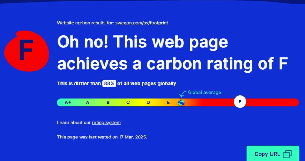 Det går dock sådär halvbra för egna sajten enligt det officiella, globala Co2 mätverktyget (se bild ovan).