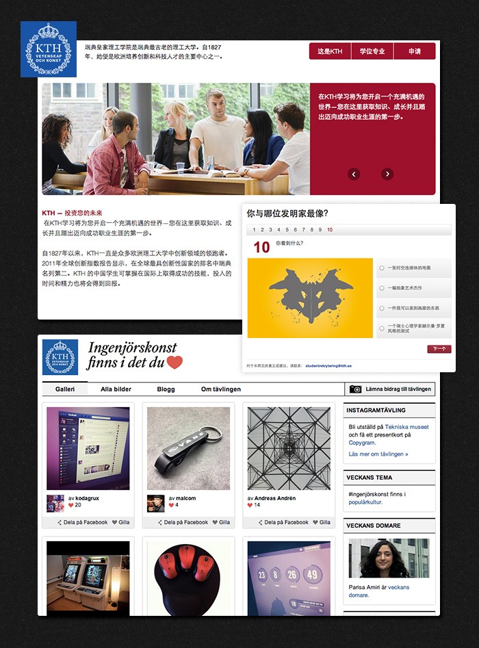 För att komma innanför den kinesiska muren (brandväggen) ville KTH sätta upp en helt kinesisk sajt med lite egna egenskaper och utformning. Den landade på en WordPress 3 CMS med plugins för t ex Weibo and Youku. Instagram API har även anropats.