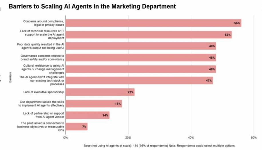 24-48h efter publicering låses våra nyheter in för icke-registrerade Patreon-medlemmar. Bli medlem, eller mer frekvent läsare. En sammanfattning av nyheter går bra att ta del av via vårt vecknyhetsbrev. Klicka härNyligen släppte Typeface en rapport kring vad som hindrar marknadsförare och marknadsavdelningar att inför AI agentstöd i praktiken. Den listan togs fram baserat på svar från 200 olika marknadsavdelningar toppas av krav på compliance, lagliga hinder samt privacy. Hela 56 procent uppger detta. Därefter kommer bristen på tekniskt stöd för att kunna iscensätta agenter, som 53 procent saknar. På tredje plats finns utmaningen att datan inte är tillräckligt bra, ren eller välstrukturerad för att kunna utnyttjas.