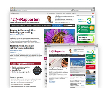 MiljöRapporten är en ny SiteVision CMS kund från september 2013. Den nya webben har både nyhetsbrev, engelsk variant och inloggning (utan forms validation och med taggar som skrivs ut). Men det verkar vara svårt för SiteVision releaserna att få in responsiv design.
