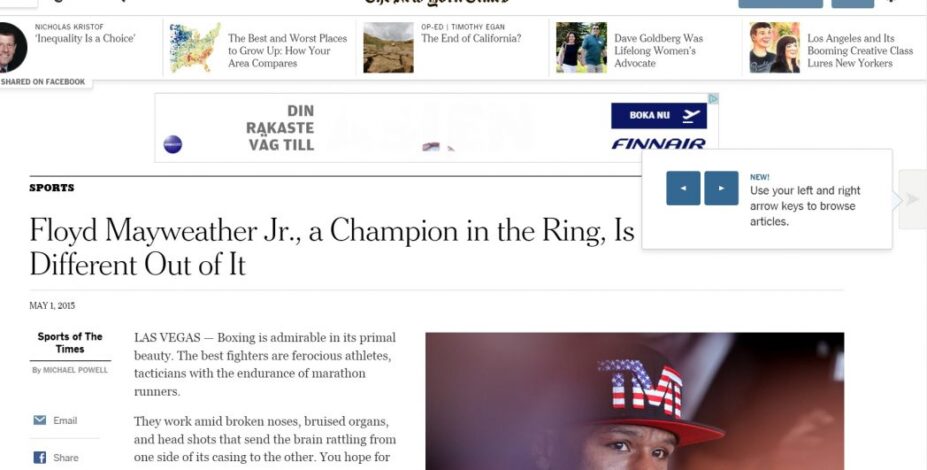 Ofta innovationsdrivande NYTimes har hört er då de experimenterar vidare med egna digitala produkten. Även i desktop blir numera en knapptryckning och mussvepning till höger samma sak som att ”bläddra sida”. Precis som när tidningen trycks på papper.