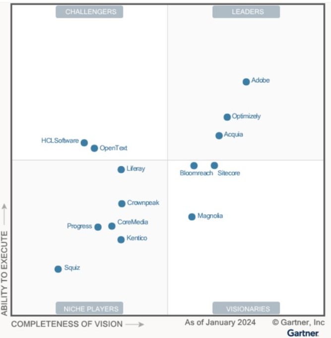 Får vi se om denna kvadrant blir lika omtalad som den för CDP, där många hade åsikter om supersvitarnas dominans i toppen. För DXP har Gartner en topptrio, med Adobe i topp följt av Optimizely och Acquia Drupal.