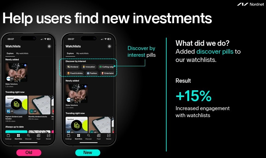 Karsten Franke, Growth Marketing Manager Nordnet, med en bakgrund i Anegy och Precis Digital driver optimeringsarbetet som tidigare lett till framgångar inom ”discover pills” (delar av sajt och app som går/används över förväntan av slutänvändare och som man satsar på/lyfter fram).