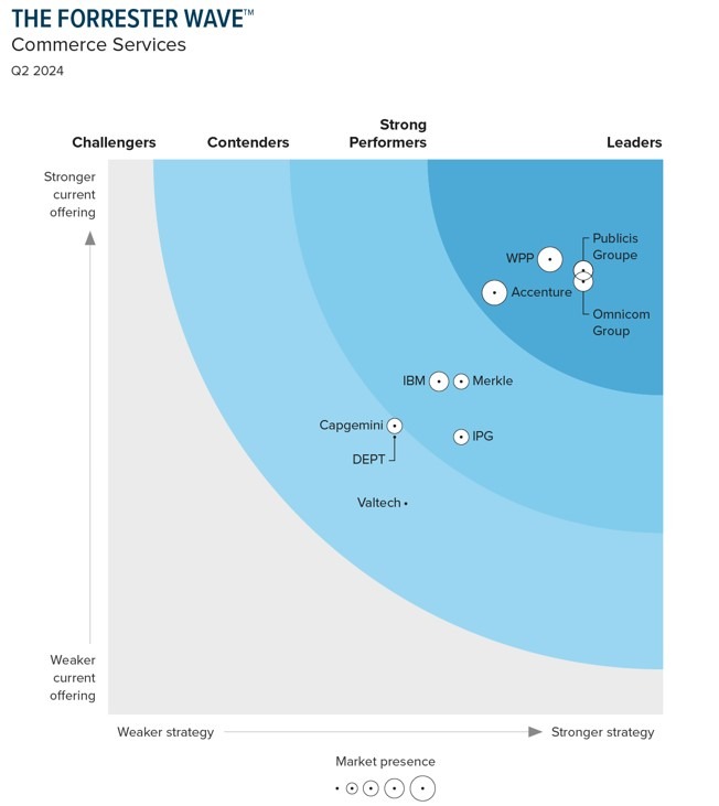 Svaret enligt senaste Forrester Wave Commerce Services Q2 2024 kan kännas främmande som svensk eftersom det inte alls är aktörer som kopplas samman med e-handel sett till de svenska filialerna av nätverken och företagen. Det är enligt Forrester nämligen Publicis, WPP och Omnicom som är bra mycket bättre än t ex Accenture, Valtech och Capgemini här. På MKSE.com kunde vi förvisso se dessa tendenser ta form med enorma byrågruppsatsningar som den WPP Wunderman Thompson Commerce började göra 2018-2019.