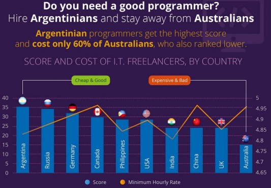 Köp designers från Tyskland och programmerare från Argentina. Undvik kanadensisk design eller webbutvecklare från Australien. De argentinska java, PHP och .NET-tjänsterna kostar även bara 60% av vad australienska utvecklare kostar. Som dessutom fick mycket sämre betyg.