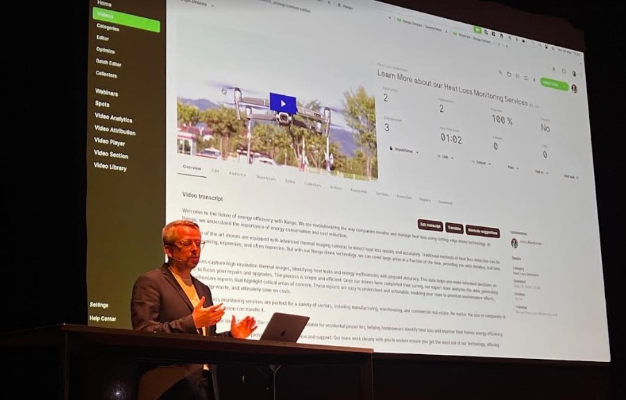 Givetvis är AI ett ämne som dyker upp relativt tidigt i VD Thomas Madsen-Mygdals keynote. Hur ser då AI ut i videohanteringsprodukten 2024? Det är bl a en taggning kring att en producerad video är äkta, ”REAL” finns med bredvid redovisningen om kvalitet av videokälla, om TwentyThrees egna algoritmer bedömer materialet vara så.