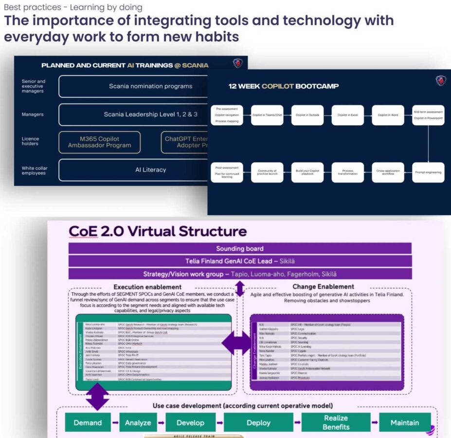 I Scanias fall handlar mycket om on-boarding, frivilligt deltagande via ett early adopter program, ett ”nomineringsprogram”, en egen 12 veckors copilot bootcamp där främst Microsofts AI i traditionella Office sviten etc. aktiveras och användningen lärs ut och diskuteras. Scania vill främst identifiera, träna upp och uppnå nya sätt att arbeta och nya vanor inom bolaget. AI som en del av kanske främst HR-relaterade stöd och delar.
