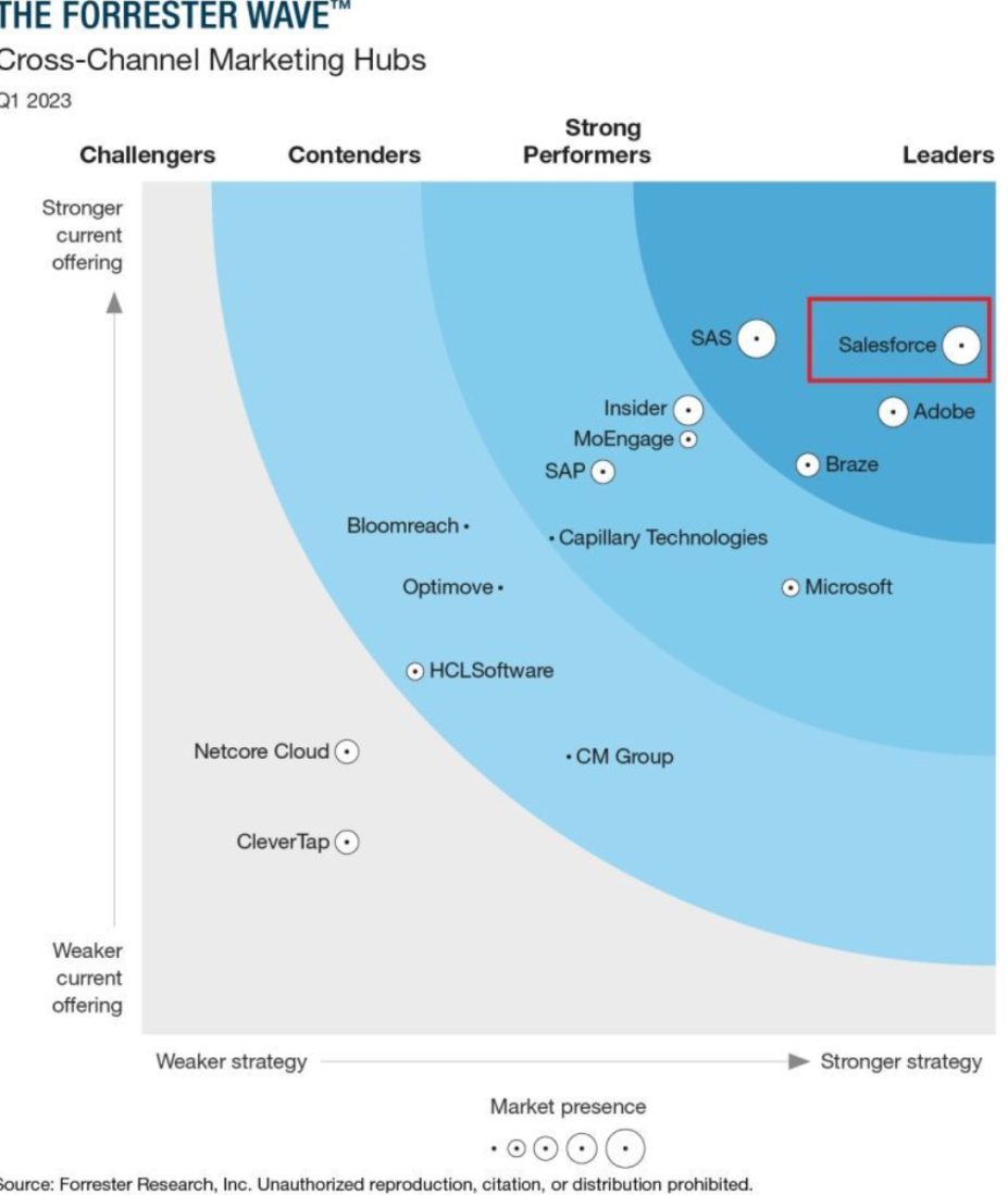 Här kan anledningen till att Salesforce saknades i årets Gartner DXP Quadrant finnas, det kan vara att de slagit ihop sina påsar med Forrester istället. Här toppar iaf CRM-aktören. Före SAS Institute, Adobe, snabbväxande Braze i ledarsfären. Därefter syns Insider, MoEngage, SAP, Capillary och Microsoft.