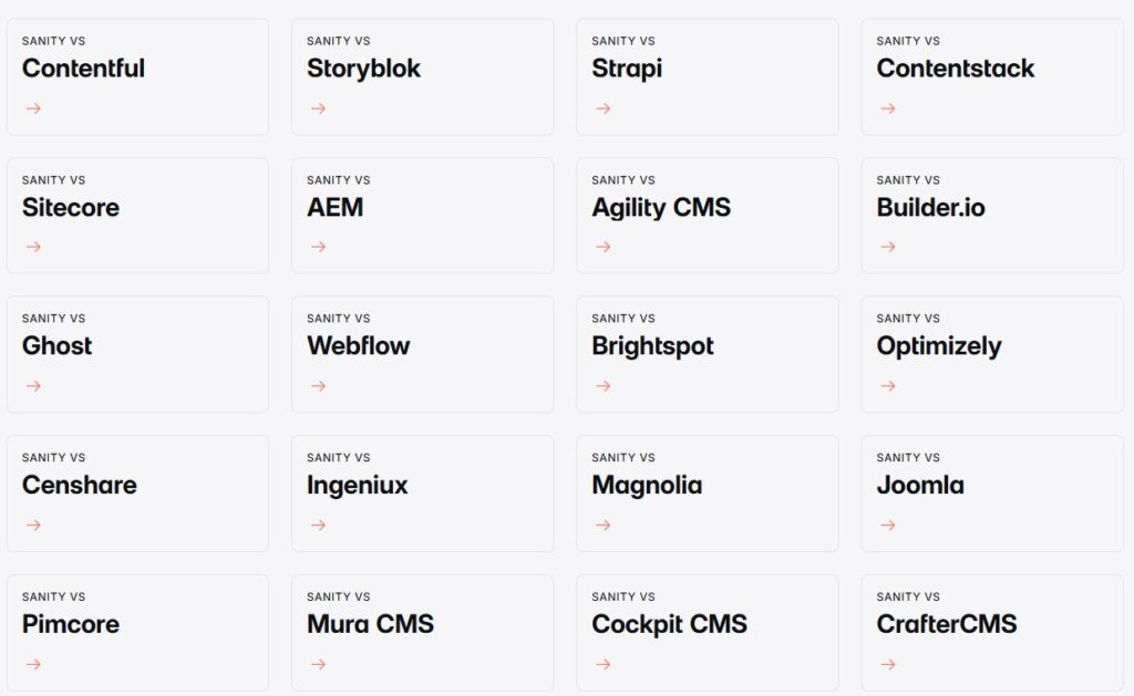 Nya lösningar som Sanity marknadsför i år är egna AI initiativet ”Sanity AI Assist”, Sanity Content Operating System idén, Sanity Create, Content lake CDN, Sanity Studio Real-time + Visual editing. Bolagets jämförelsegraf är en ny typ av ”battle card”, den är väldigt omfattande och aggressiv.