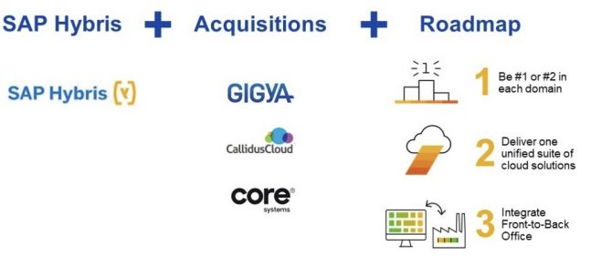 Men han kom inte in via det framgångsrika tyska hybris förvärvet med påföljande uppbyggandet av SAP Customer Experience (och lite mer kryptiska SAP C/4HANA som kom två år efter det) erbjudandet. Det var före Alex tid. Då var han mer i en generell COO roll på SAP. Och de senaste åren har han främst erfarenhet från Ariba-förvärvet (ett B2B nätverk och marknadsplats). Därefter har han i 24 månader tagit fram just paketeringen SAP C/4HANA (se bild nedan). Som är långt ifrån lika välkänt i Sverige som hybris en gång var. Produkten består av: