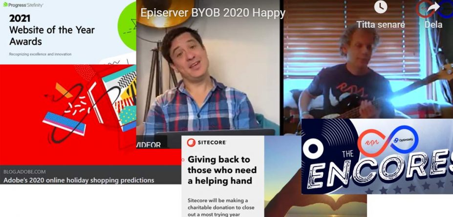 Adobe Experience och Commerce väljer att redovisa shoppingtrender och via moderbolaget Adobe visar man upp en showreel om ”det ovanliga året”. Sitefinity Progress, som haft några år av tvivelaktiga beslut inom sin marknadsföring, har en ovanligt tyst högtid med enbart några ”Sitefinity Website of the Year Awards” vinnare redovisade. Sitecore väljer att berätta att man ger ett bidrag till välgörande ändamål med en stockart-bild. Salesforce hade just sin stora digitala Dreamforce och väljer främst att visa upp Marc Benioffs budskap från den julpyntade San Francisco scenen.