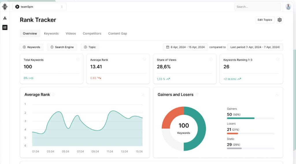 Team5pm som finns i Stockholm, Amsterdam, Kapstaden, och Warsawa jobbar med alla från Prime Video, WWF, Svenska Spel, Gymgrossisten, Maria Nila och Specsavers. De använder bolagets social SEO-verktyg Topictree. Nu har en ny Rank Tracker-funktion släpps som för första gången även kan låta användare följa hur de rankar på olika sökfraser, inte bara på YouTube och Google, utan även på TikTok. Det ska vara den första gången som det går att göra så.