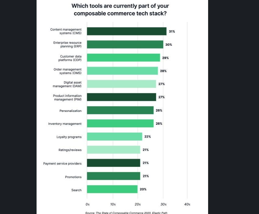 Det är istället tydligen ”composable ERP” som gäller. En aning märkligt då affärssystem sällan är vad som det först talas om då det kommer till headlessmiljöer. Det är heller långt ifrån det första ERP aktörerna själva identifierar sig med eller vill lyfta fram. Därefter kommer däremot ”kittet” CDP, följt av orderhanteringssystem och DAM.