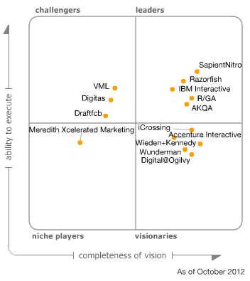 I senaste Magic Quadrant från Gartner kring världens ledande digitala marketing agencies blev det SapientNitro, Razorfish, IBM Interactive, R/GA Interpublic och AKQA som kammade hem priset som de rådande ledarna.