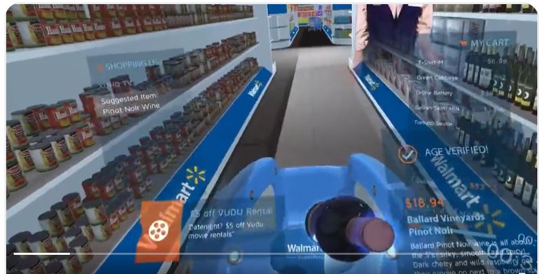 Matbutikskunder med VR-glasögon ska under sju, åtta sekunder taffligt föra över en vinflaska till en klumpig digital varukorg, menar Walmart. Sedan under lika många sekunder, och med gnisslande ljud, ”förflyttas” till ett nytt Walmart våningsplan med andra varugrupper. Allt i en dyster, steril betongmiljö (!). Att det finns en virtuell kassörska utan ben som hänger på genom våningsplanen och tjatar sig till att kunden adderar en TV (som flygs till bilen via inomhusdrönare!) hjälper knappast. Inte heller den inbyggda ålderskontroll, Walmart Pay-integration eller kontakt med kylskåpet hemma känns som något vi inte sett flera decennier tidigare.