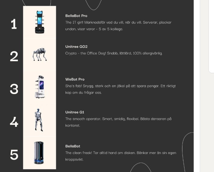Det är Bellabot serveringsrobot som sålt bäst, eller iaf toppar egna topplistan. Följd av robothunden Unitree och WeBot Pro mer mångsidiga robot.0:-per dag kostar en botAD:Få ovärderliga råd och kunskap inom området. Öppna upp ett MKSE.com expert online videosamtal på några minuter. Skaffa ett MKSE 🔭 Premium konto idag. En del av MKSE Patreon medlemskapet. Expertutvärdering, personligt stöd plattformsval, intel/databastillgång och rådgivning längs med vägen.