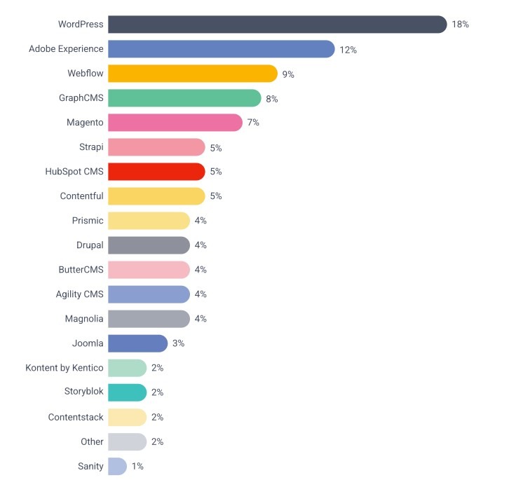 Där finns WordPress i topp följt av Adobe AEM. Men därefter kommer faktiskt redan Webflow och GraphCMS. Det var otippat. Däremot är det i denna typ av whitepapers högst troligt att Storyblok frågat kunder som antagligen är eller kan tänka sig bli förstasystems- eller andrasystemsanvändare av Storyblok headless. Själva har man enbart runt 2% av den svenska marknaden idag, visar siffrorna.